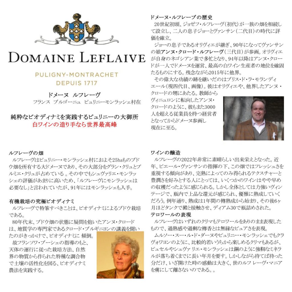 このルフレーブの三代目の当主となった方で、彼女のワインが、ブルゴーニュの最高峰の白ワインにまでなりました。
